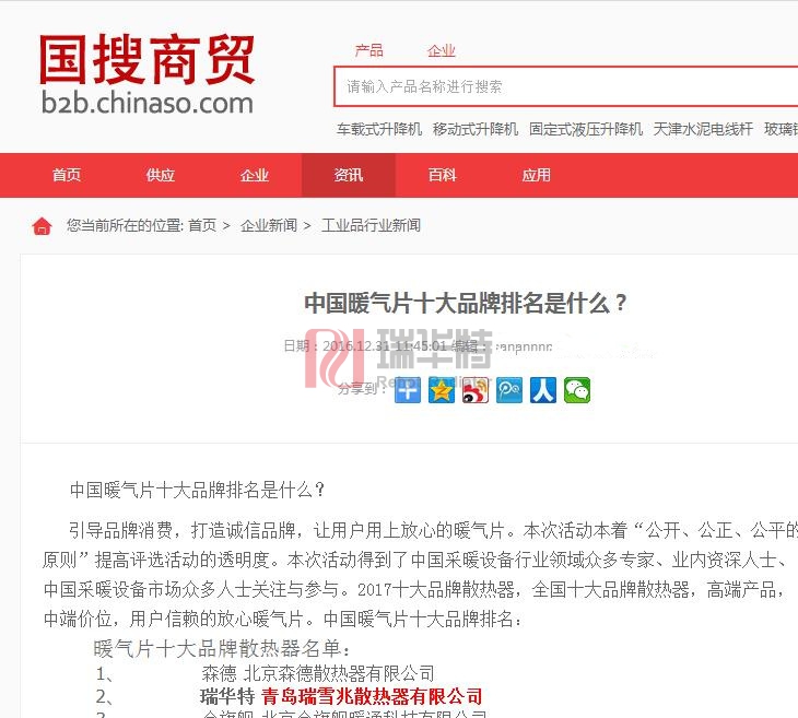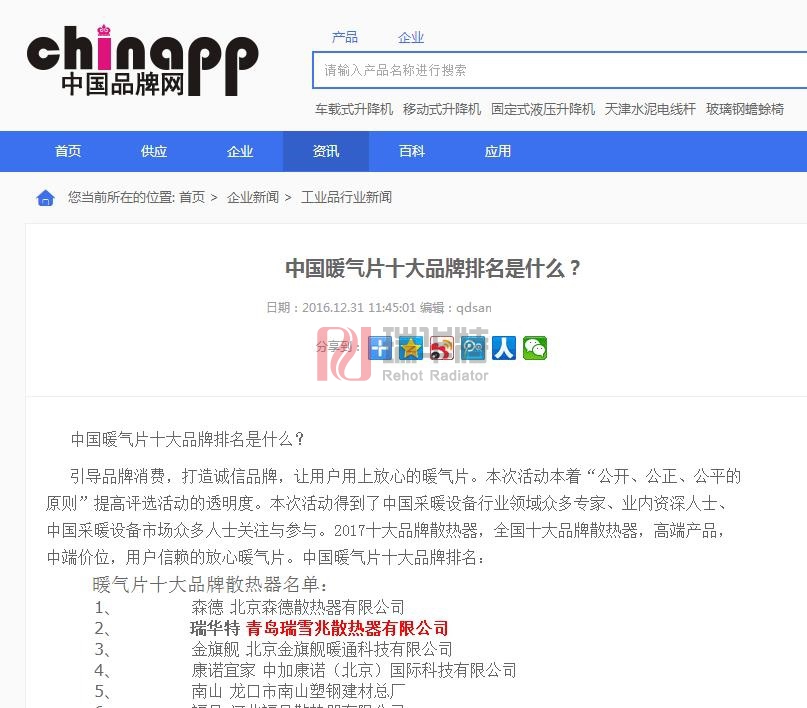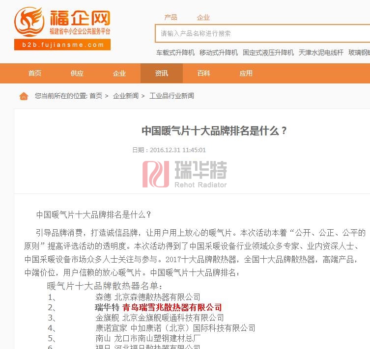 2017年最新暖氣片散熱器品牌多家媒體發布。本次評選結果,被各大網站和媒體轉載和發布,獲得很好的社會反饋,其中瑞華特散熱器入選2017暖氣片品牌散熱器,獲得較好的反饋。各大上榜品牌都更為努力力爭為社會制造更好更實惠的暖氣片,本次評選結果,社會民眾表示肯定,將推動暖氣片行業的發展。
